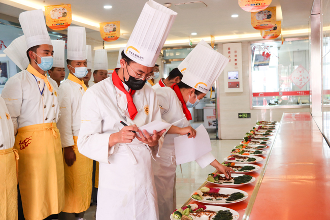 这次考核所用到的手法是一种难度较大的艺术操作手法——摆贴法,就是运用巧妙的刀法,把原料切配成特殊形态,按构思和图案要求,摆贴成各种图案,如禽鸟、人物、树叶、鱼鳞等,需要具备娴熟的拼摆技巧和一定的艺术修养,比赛现场,每一位学生都全力以赴。